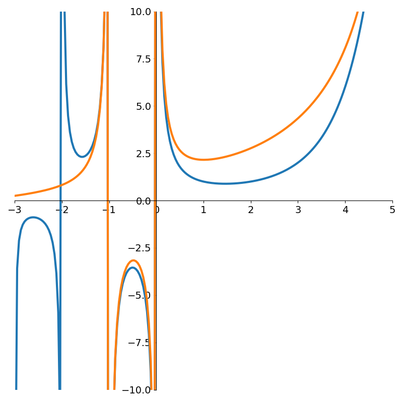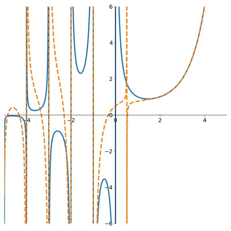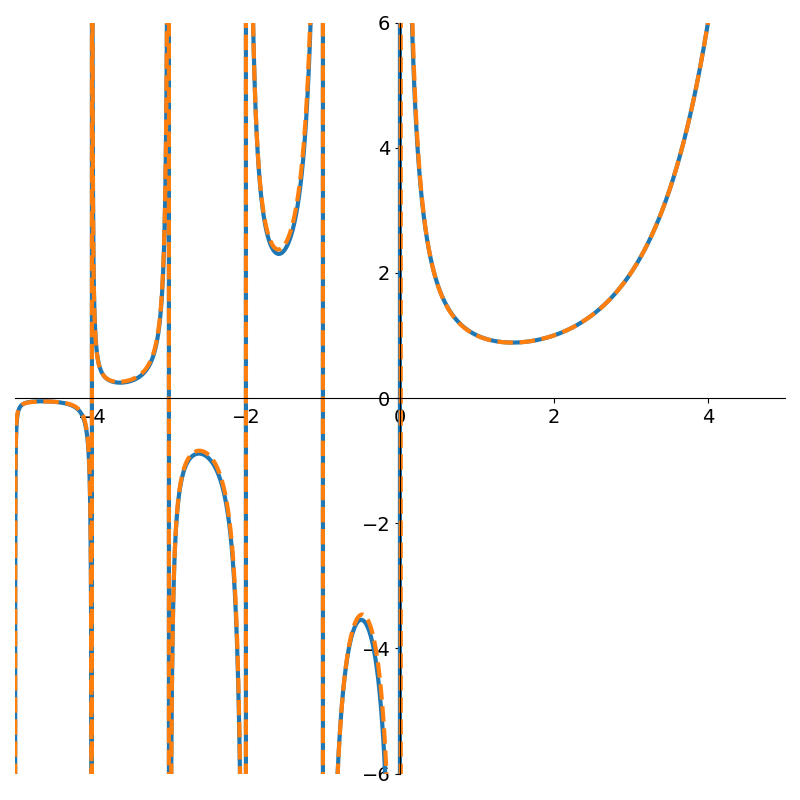\[f(x) = {a_0+a_1x+a_2x^2+\cdots+a_mx^m \over 1+b_1x+b_2x^2+\cdots + b_mx^m}.\]Note the subtle difference between numerator and denominator. Unlike in the numerator, there is no free parameter for the offset term in the denominator (i.e. no \(b_0\)). This is effectively a normalisation to prevent redundancy.