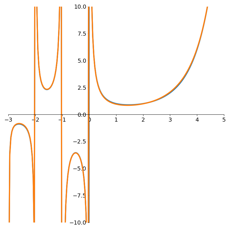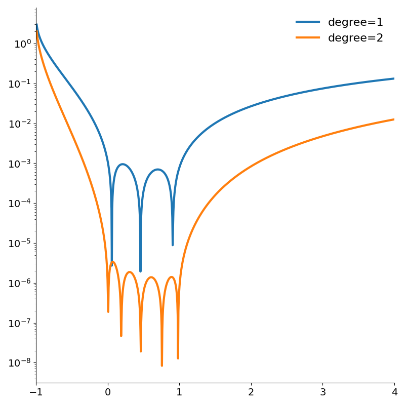 Figure 2 shows how the absolute error of even the degree 1 rational approximation is very low within the interval [0, 1]. Both errors quickly grow outside the interval.