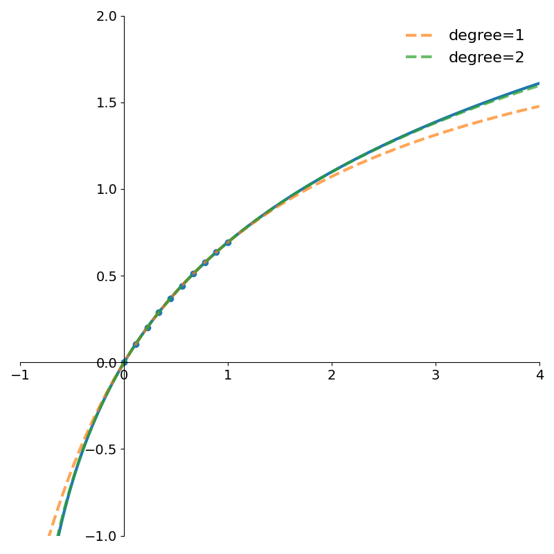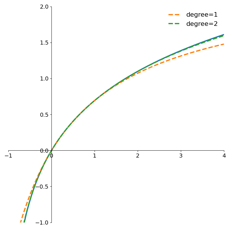 return a, b Figure 1 shows rational function approximations using OLS for various degrees \(m\) compared with the true function \(\log(1+x)\).
