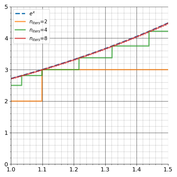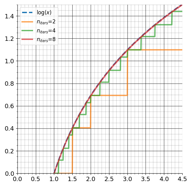 Figure 2 shows the effect of choosing a larger number of iterations to approximate the logarithm. Note how the approximation is piecewise constant (the number of levels is \(2^{n_{iters}}\))