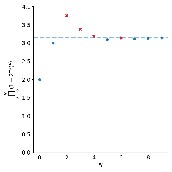\[x \approx \prod_{k=0}^N (1+2^{-k})^{d_k}\]The maximum value we can achieve (with \(d_k=1\) for all \(k\)) is \(\prod_{k=0}^N (1+2^{−k})\approx 4.768\) as \(N\rightarrow \infty\).