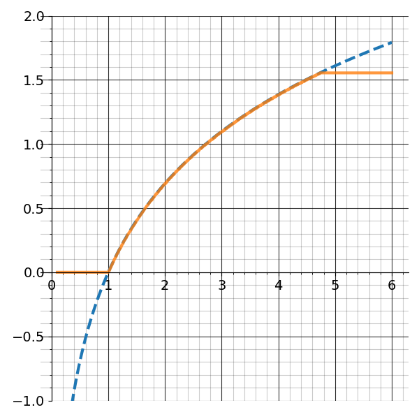 Suppose we want to compute \(\log 3.14\). We start by initialising a variable \(\hat{x}=1\). We then multiply this by 2 to get \(\hat{x}=2\). Since this is below our desired value of \(x=3.14\), we’ll try increasing the value again but instead of doubling it, we’ll multiply 1.5. This gives a new value of \(\hat{x}=3\) which is still below the desired value.