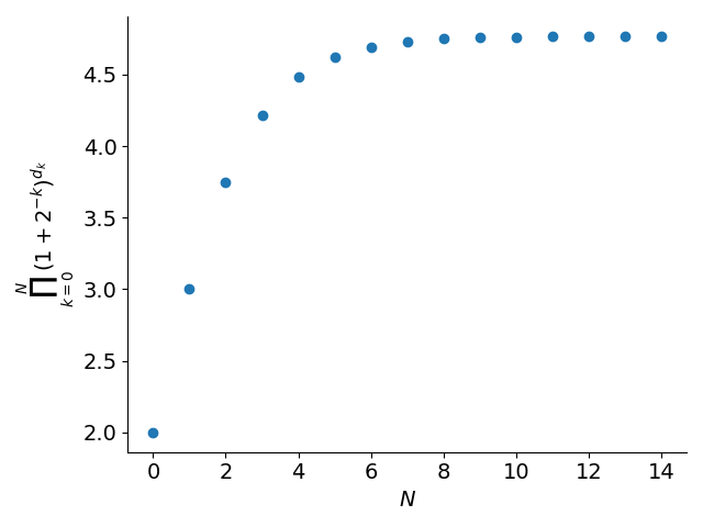 \[x \approx \prod_{k=0}^N (1+2^{-k})^{d_k}\]The maximum value we can achieve (with \(d_k=1\) for all \(k\)) is \(\prod_{k=0}^N (1+2^{−k})\approx 4.768\) as \(N\rightarrow \infty\).