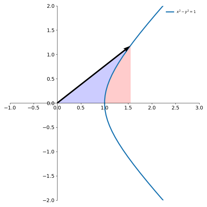 \[x(\theta) = \cosh \theta\\ y(\theta) = \sinh \theta\]the blue area in figure 9 is then given by