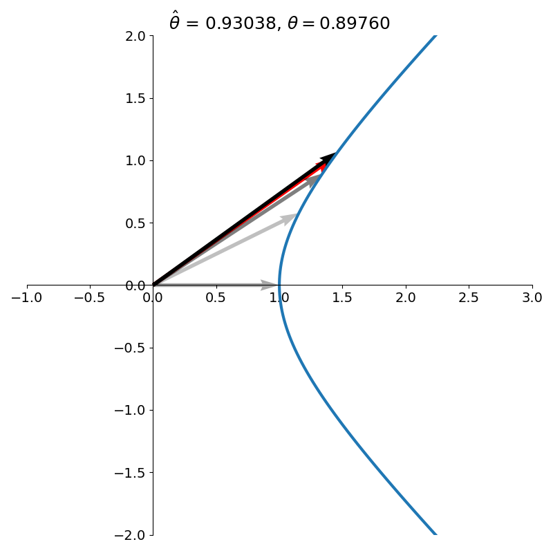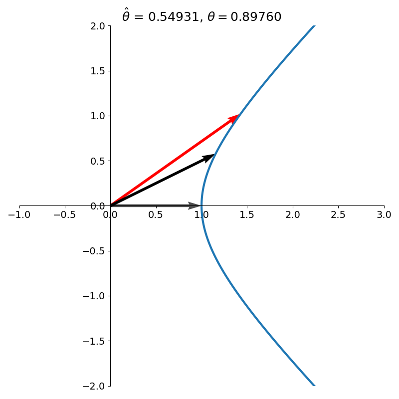 \[H_\theta = \begin{bmatrix} \cosh \theta & \sinh \theta\\ \sinh \theta & \cosh \theta\\ \end{bmatrix}\]to rotate a vector.1 Crucially, the vector is no longer rotated on the unit circle but on the right branch of the unit hyperbola. The hyperbolic rotation is illustrated side by side with the corresponding circular rotation in figure 11.