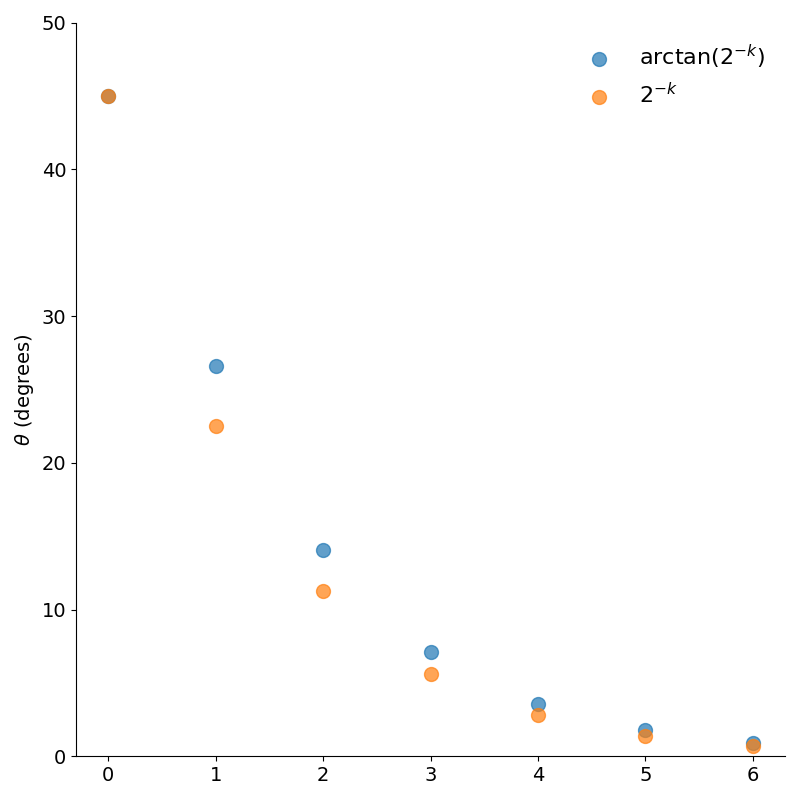 We repeat this process of rotating clockwise or counterclockwise depending on whether our vector is currently over or under the desired angle. Each iteration, the angle we rotate by gets progressively smaller. Specifically, the angle at iteration \(k\) is given by