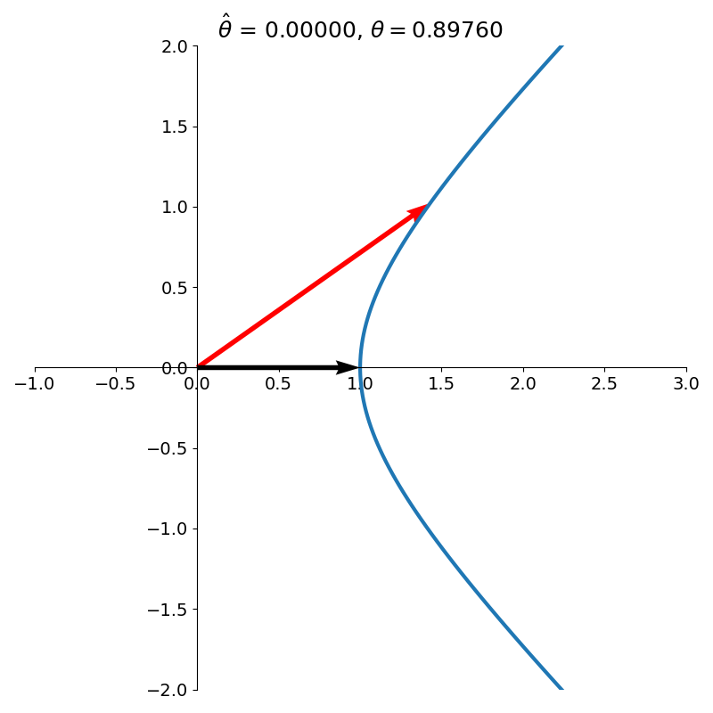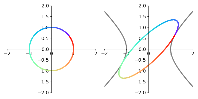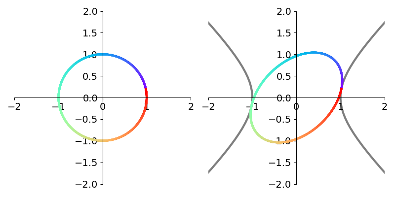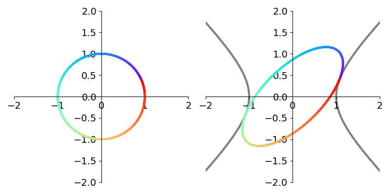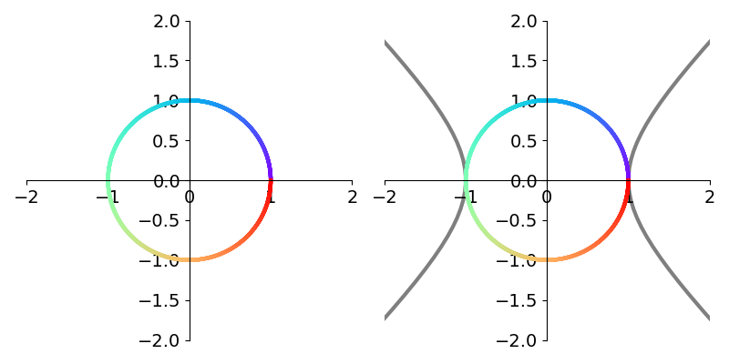 \[H_\theta = \begin{bmatrix} \cosh \theta & \sinh \theta\\ \sinh \theta & \cosh \theta\\ \end{bmatrix}\]to rotate a vector.1 Crucially, the vector is no longer rotated on the unit circle but on the right branch of the unit hyperbola. The hyperbolic rotation is illustrated side by side with the corresponding circular rotation in figure 11.