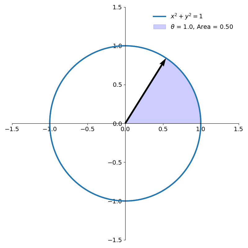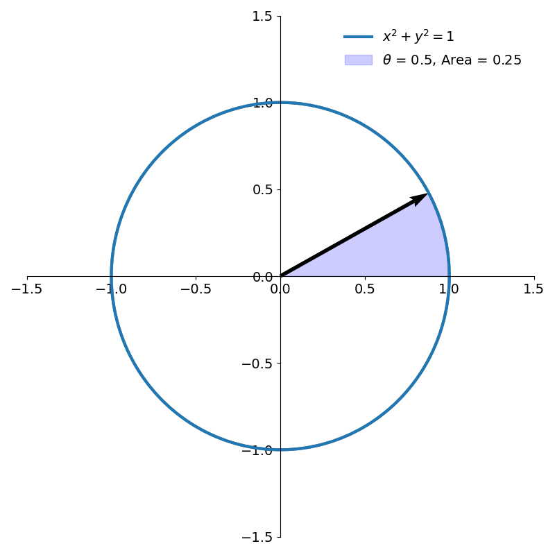 An angle \(\theta\) is typically defined in terms of the arc length swept out on the unit circle. But another, equivalent, way to define an angle is by the area of the sector it sweeps out. For a circle of radius \(r\) and an angle \(\theta\), the ratio of the area of the sector to the full circle is the same as the ratio of the angle to that of the full circle.