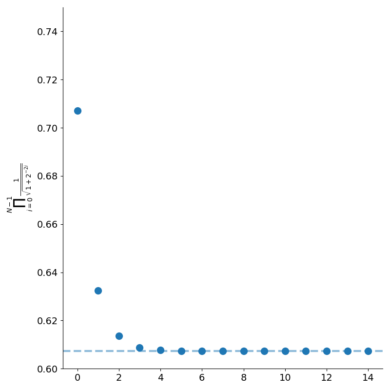 \[\log K_N = -0.5 \sum_{k=0}^{N-1} \log \left({1 + 2^{-2k}}\right)\]One natural question to ask is whether this series converges as \(N\) goes to infinity. Since \(\log(1+x) \approx x\) for small \(x\), we can see the series behaves similarly to \(\sum_{k=0}^{N-1} 2^{-2k}\) which is a convergent geometric series. As shown in figure 7, the product does indeed converge (rather rapidly) to approximately \(0.607\).