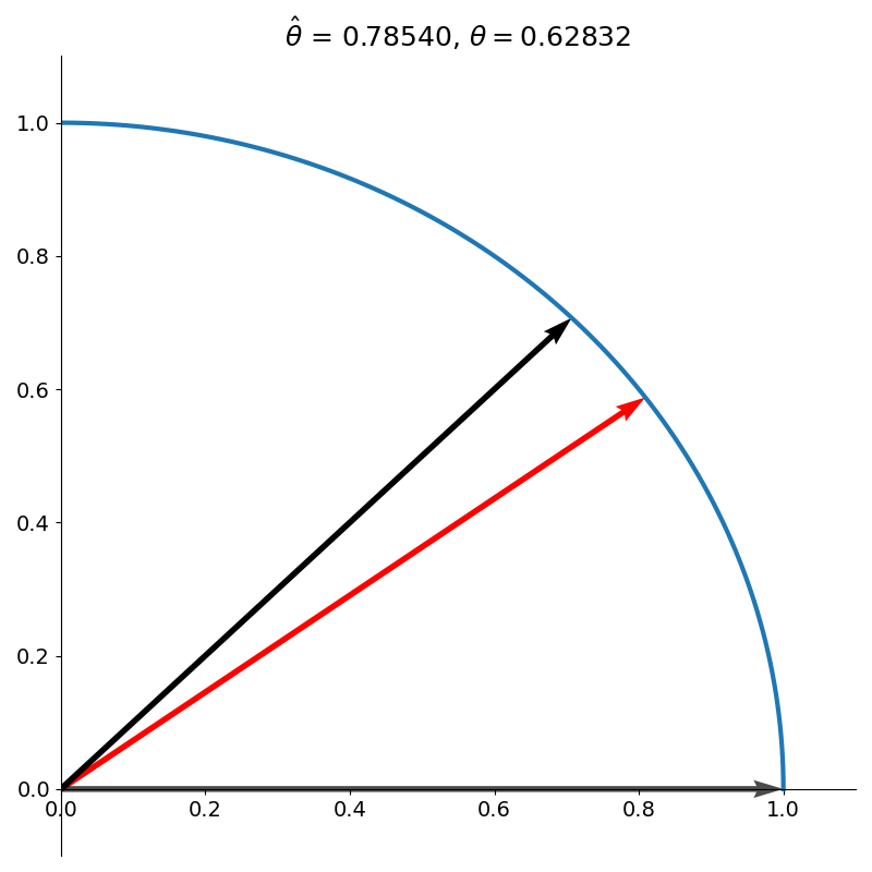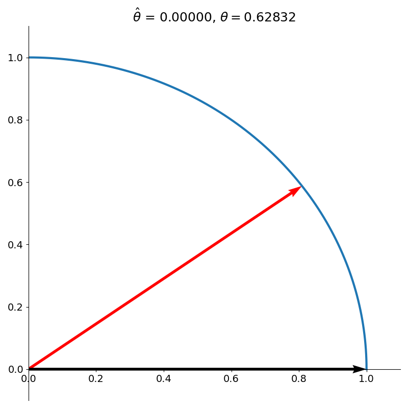 The basic idea behind CORDIC is to start with a unit vector on the \(x\)-axis and apply a sequence of smaller and smaller rotations until the vector lies close to the desired angle. The cosine and sine are then the \(x\) and \(y\) coordinates of the final vector!