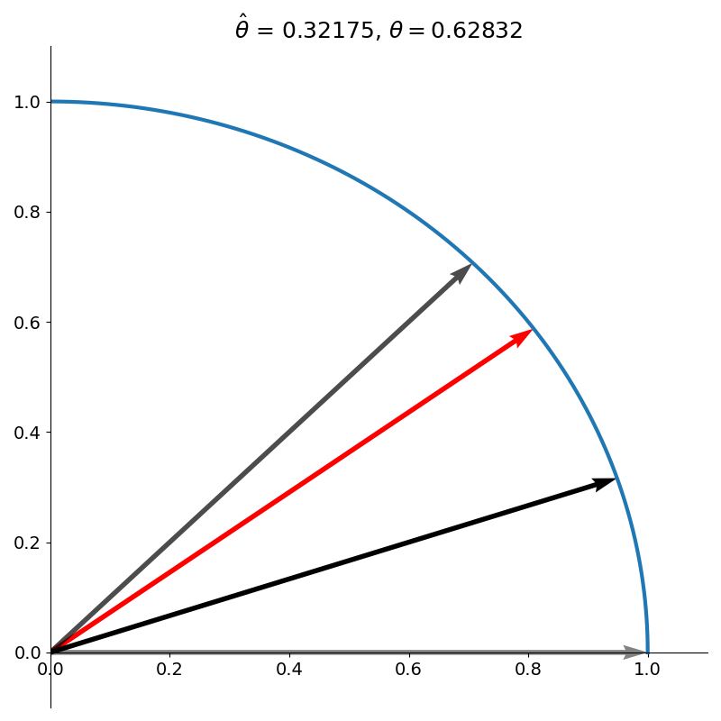 Our new vector still underestimates the target angle so we rotate clockwise again, this time by \(\arctan(1/4)\), as shown in figure 4.