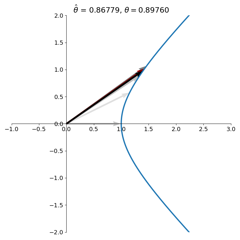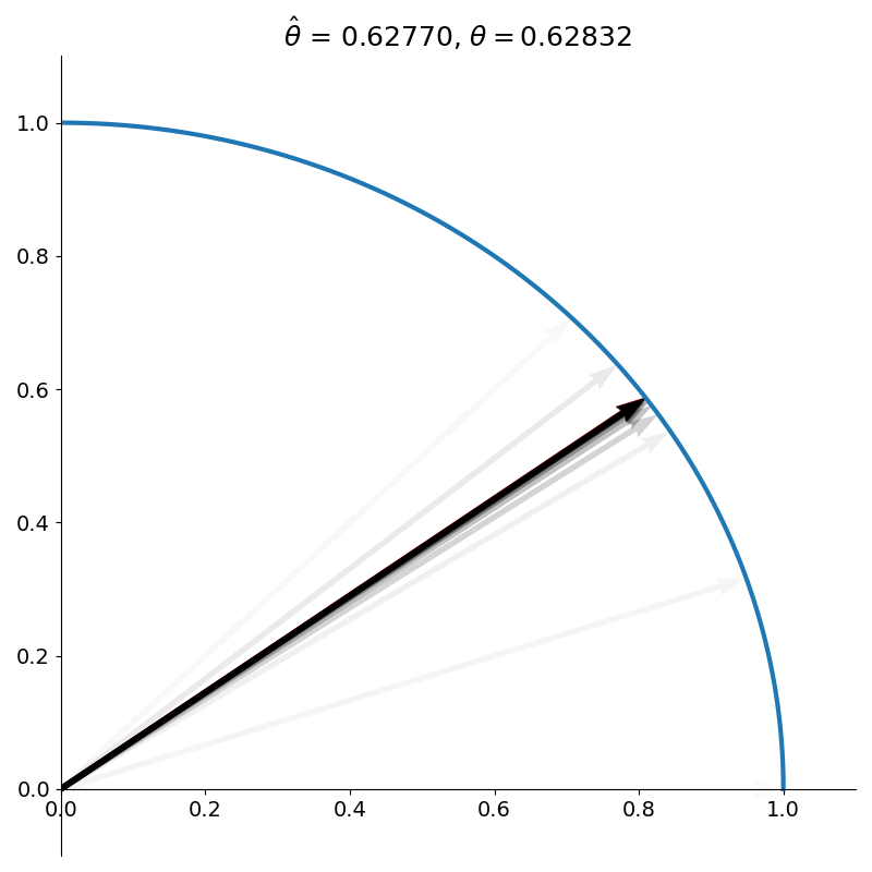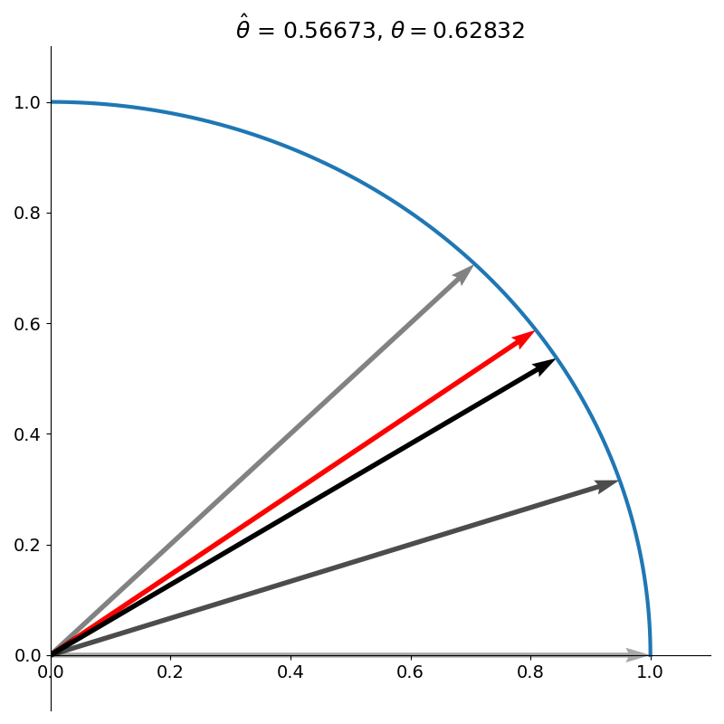 \[\theta_k = \arctan(2^{-k}).\]You can think of this like a sort of binary search. This process is repeated for a finite number of iterations or until some tolerance is reached. Figure 5 shows CORDIC after 11 iterations. We can see that our vector is nearly collinear with the target vector.
