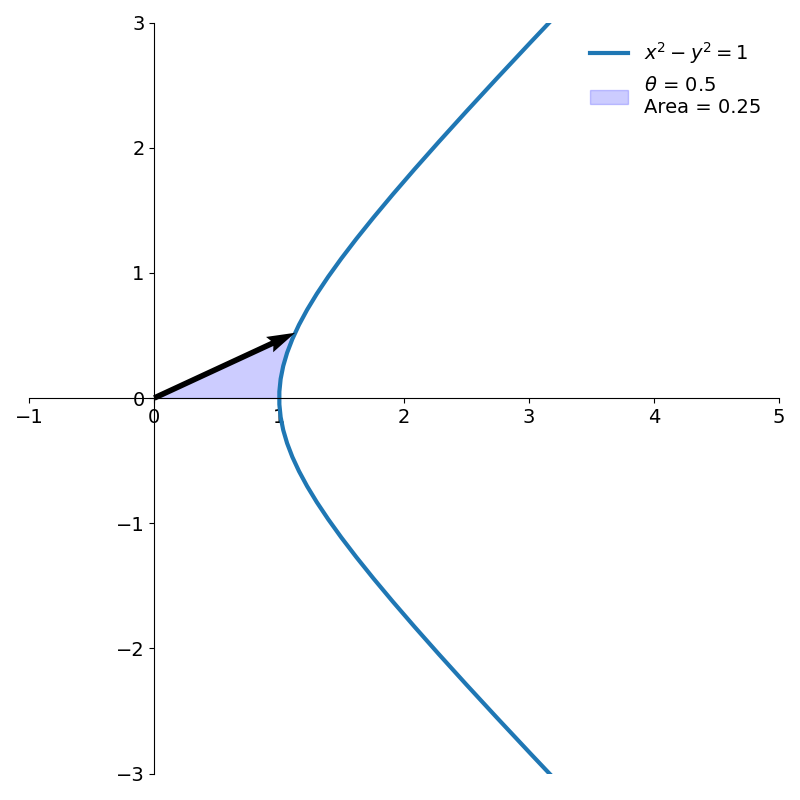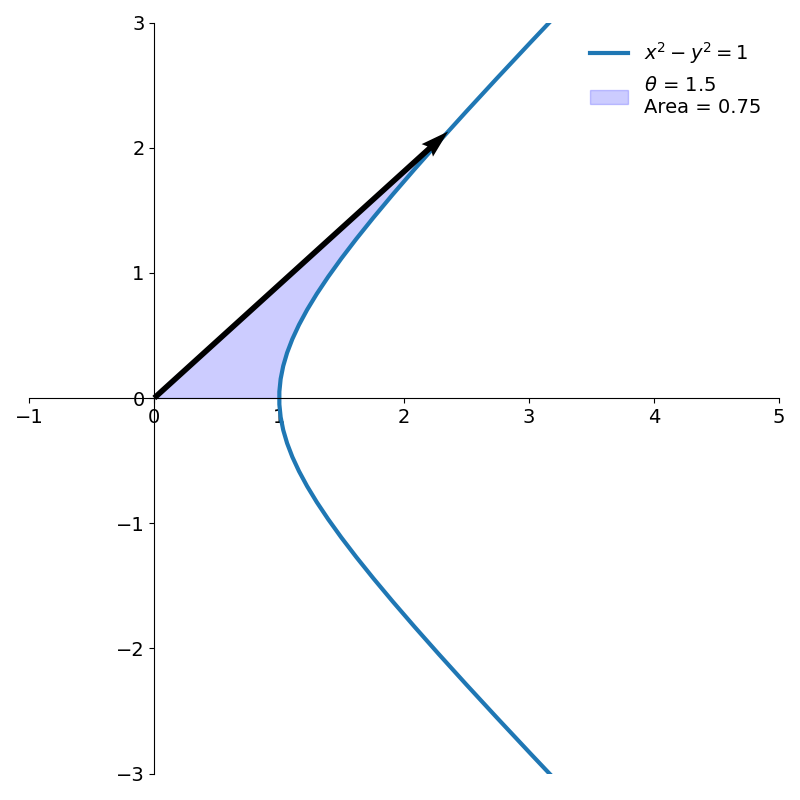 \[x(\theta) = \cosh \theta\\ y(\theta) = \sinh \theta\]the blue area in figure 9 is then given by