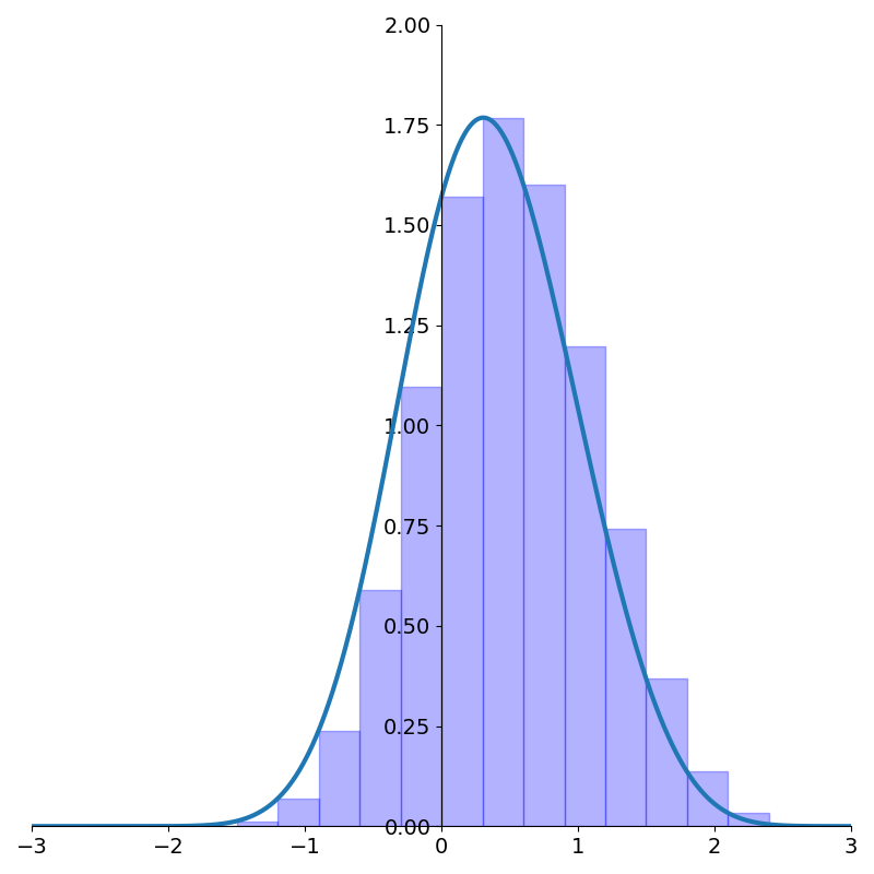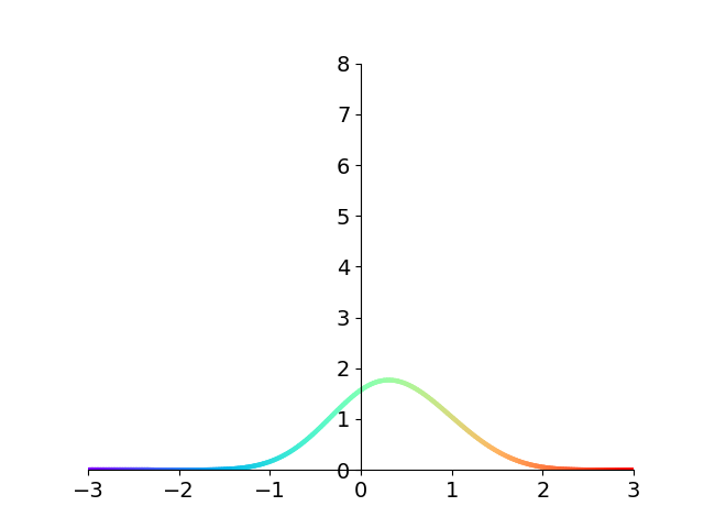 The figure makes it clear that the asymptote at 1 disappears! What’s more, the function decays extremely quickly to 0. To get a sense of just how fast this function decays to 0, compare with the standard Gaussian \(e^{-x^2}\) which is \(1.23\times 10^{-4}\) at \(x=-3\). Our integrand is down to \(9.60\times 10^{-13}\) at the same value of \(x\). Over eight orders of magnitude smaller!