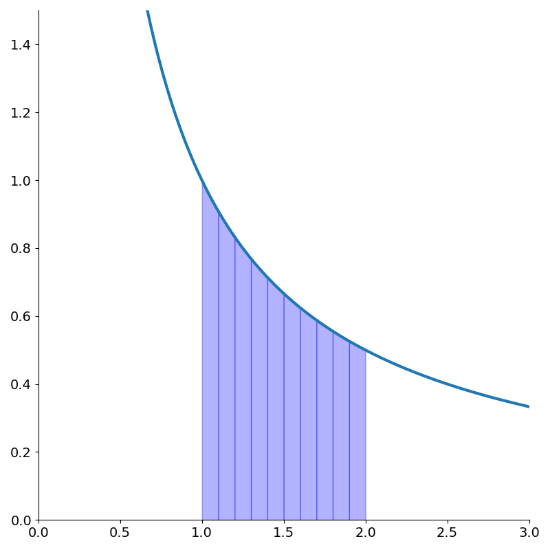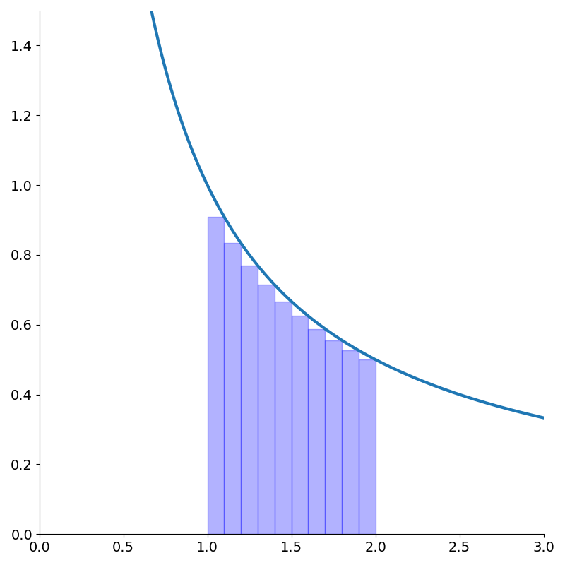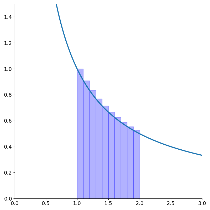 1: The rectangles don’t need to be uniformly spaced but it makes things simpler. In the limit as \(h\rightarrow 0\), this becomes equality. It’s more of a definition actually. An important caveat is that this does not work when \(a\) or \(b\) are infinite.
