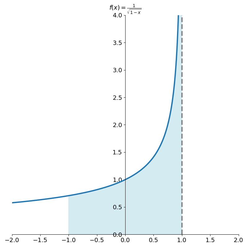 But what if the function has an asymptote at one of the endpoints? Consider integrating \({1 \over \sqrt{1-x}}\) over the interval [-1, 1].