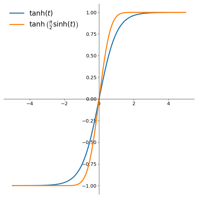\[x = \tanh\left(\sinh \left({\pi \over 2} t\right)\right)\]This function is plotted in Figure 5 along with the regular hyperbolic tangent.