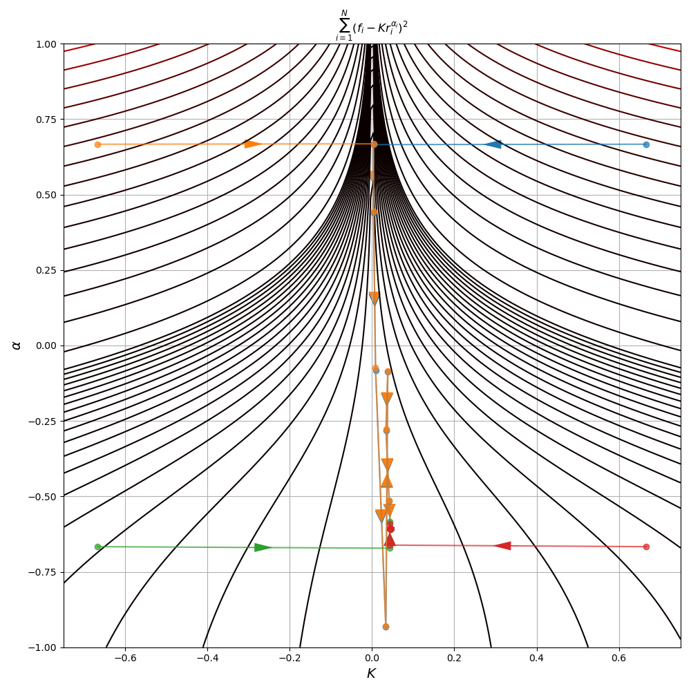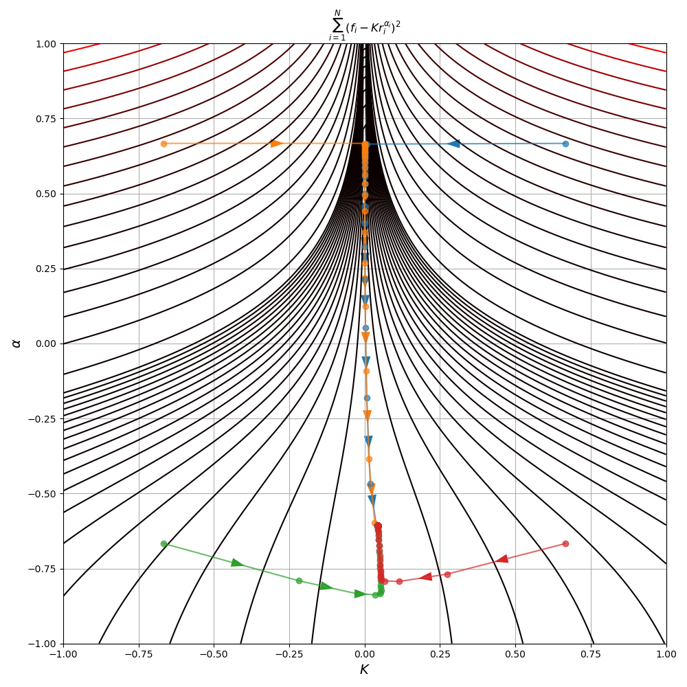 Also note that despite some initial points converging much quicker to the minimum, all 4 points did eventually reach the same minimum at \((K^\star, \alpha^\star) = (0.044, -0.607)\)