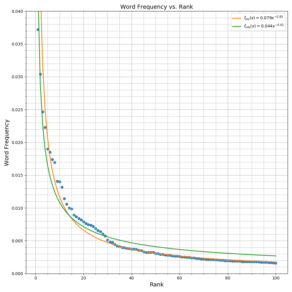 We can plot both resulting models as in Figure 6 and notice the qualitative differences between them. The model resulting from NLLS does a much better job fitting the first few high ranking word frequencies compared to the OLS model which shows very large errors (as measured by the vertical distance between the point and the graph). In the lower ranking words however, the NLLS model shows a consistent overestimation of the word frequency that the OLS model does not. In log space, this pattern is even more pronounced