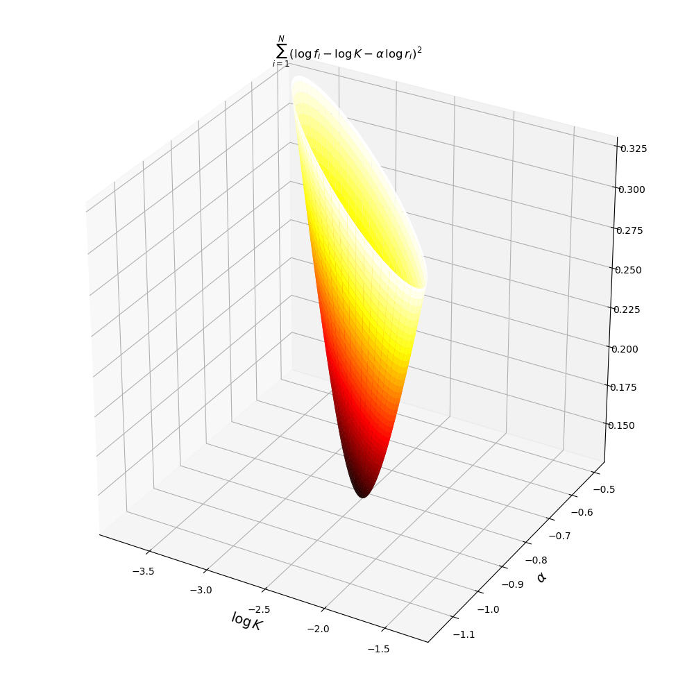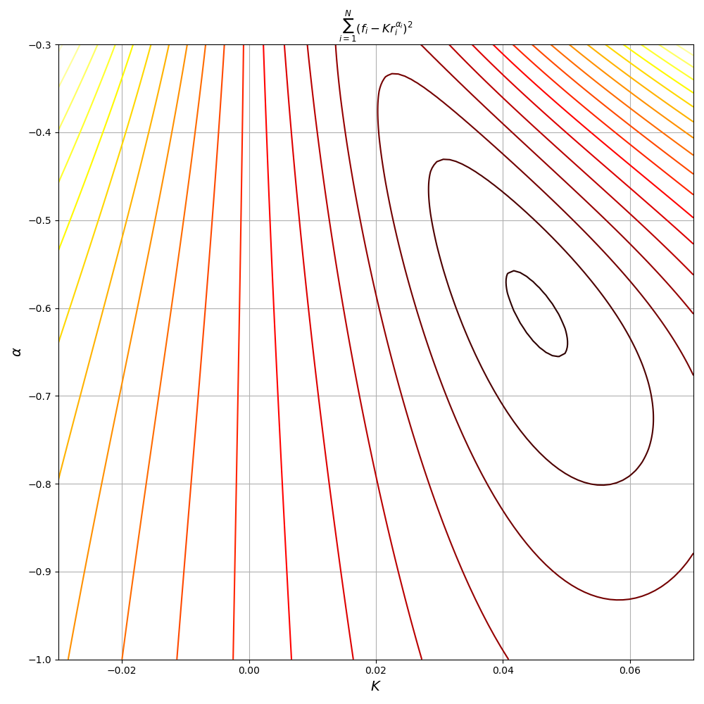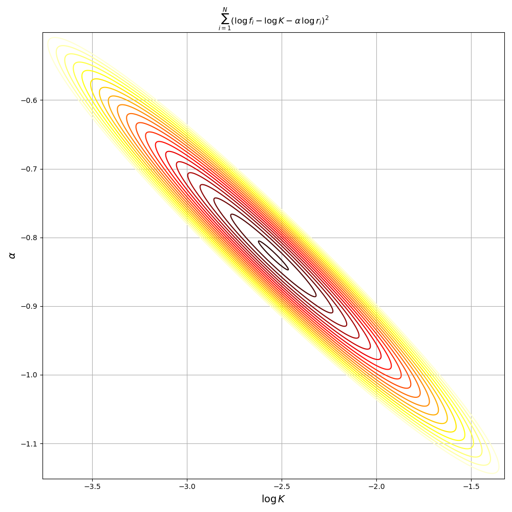 \[\nabla J = \begin{bmatrix} \frac{\partial J}{\partial K}\\ \frac{\partial J}{\partial \alpha}\\ \end{bmatrix} = \begin{bmatrix} -2\sum_{i=1}^{|V|} (f_i - Kr_i^\alpha)r_i^\alpha\\ -2\sum_{i=1}^{|V|} (f_i - Kr_i^\alpha)K(\log r_i) r_i^\alpha\\ \end{bmatrix} = \begin{bmatrix} 0\\ 0\\ \end{bmatrix}\]Far from the simplicity of the normal equations, the above is a nonlinear system of equations, which is hardly more tractable than the original optimisation problem.