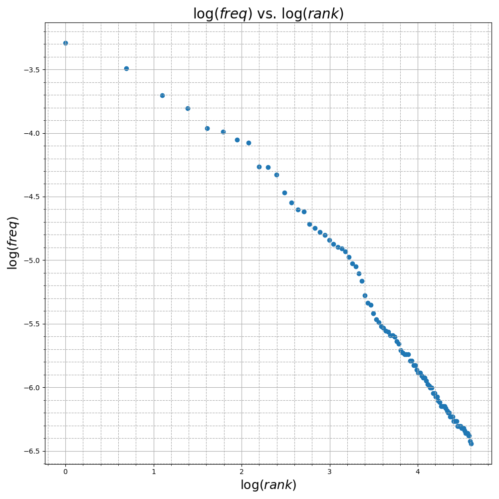return words, np.asarray(freqs)Plotting each word’s frequency in the text versus its rank as in Figure 1 gives a good indication that a power law of the form