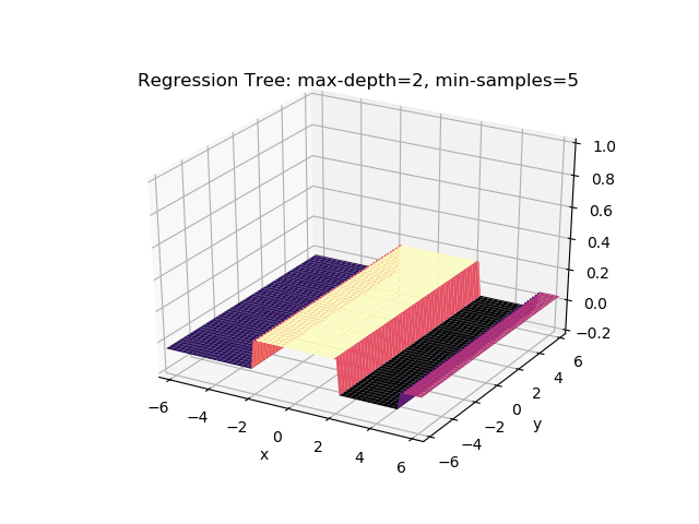 The second example shows how a regression tree can be used to approximate functions of two variables as well. Again, the animation illustrates deeper trees can approximate non-linear functions to a high degree of accuracy.