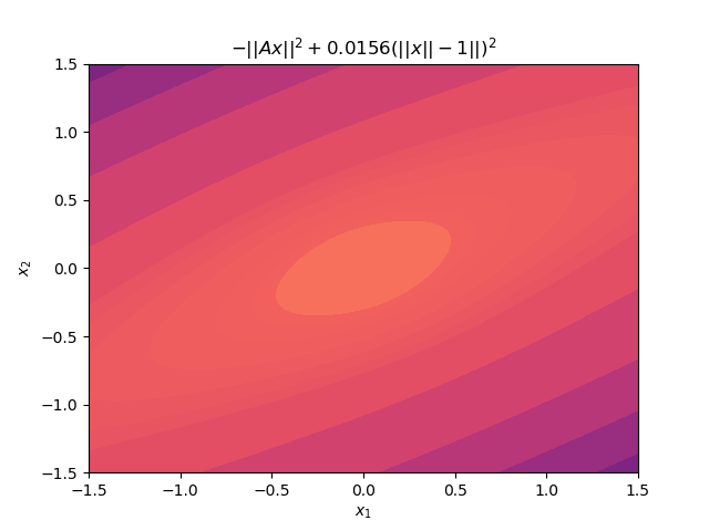 \[\begin{align*} \underset{x}{\text{minimize}}&\quad -||Ax||_2^2 + \mu \left(||x|| - 1\right)^2 \end{align*}\]The objective for the original constrained minimisation problem, \(-\left\| Ax \right\|^2\) is shown in the figure below