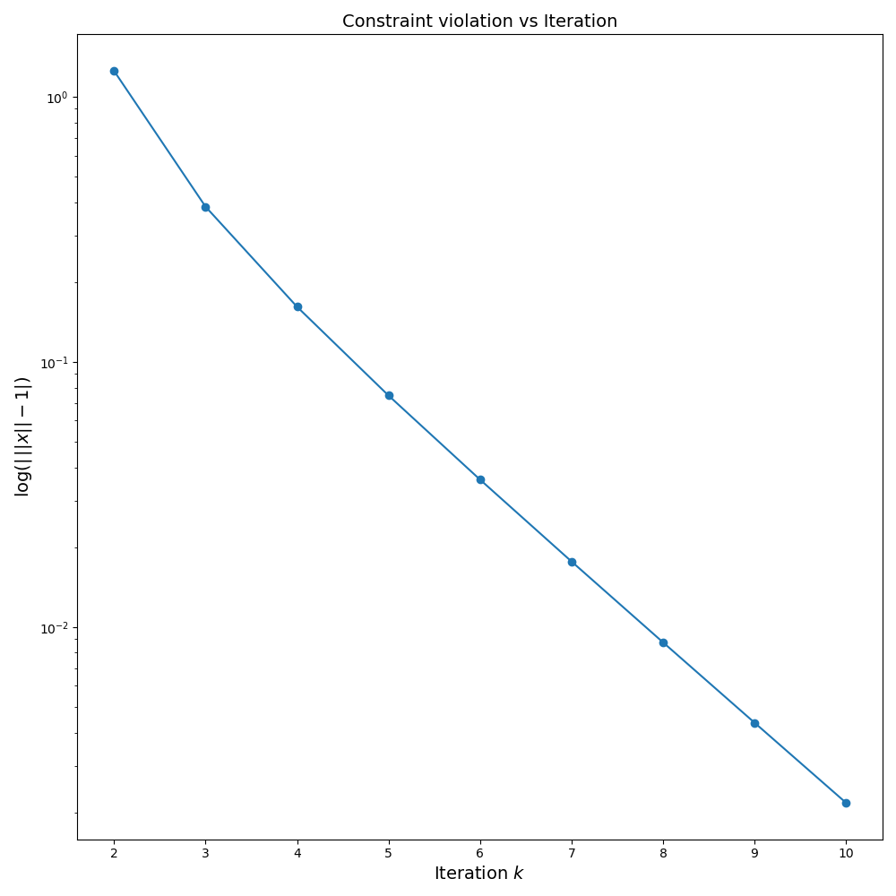 A graph of the unit norm constraint violation is shown below from which it is clear that only a few increases of the penalty parameter \(\mu\) are enough to ensure the constraint is very nearly satisfied with equality.