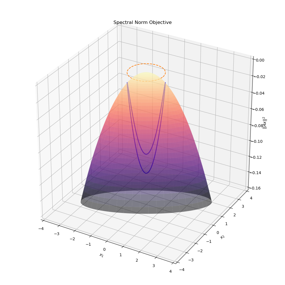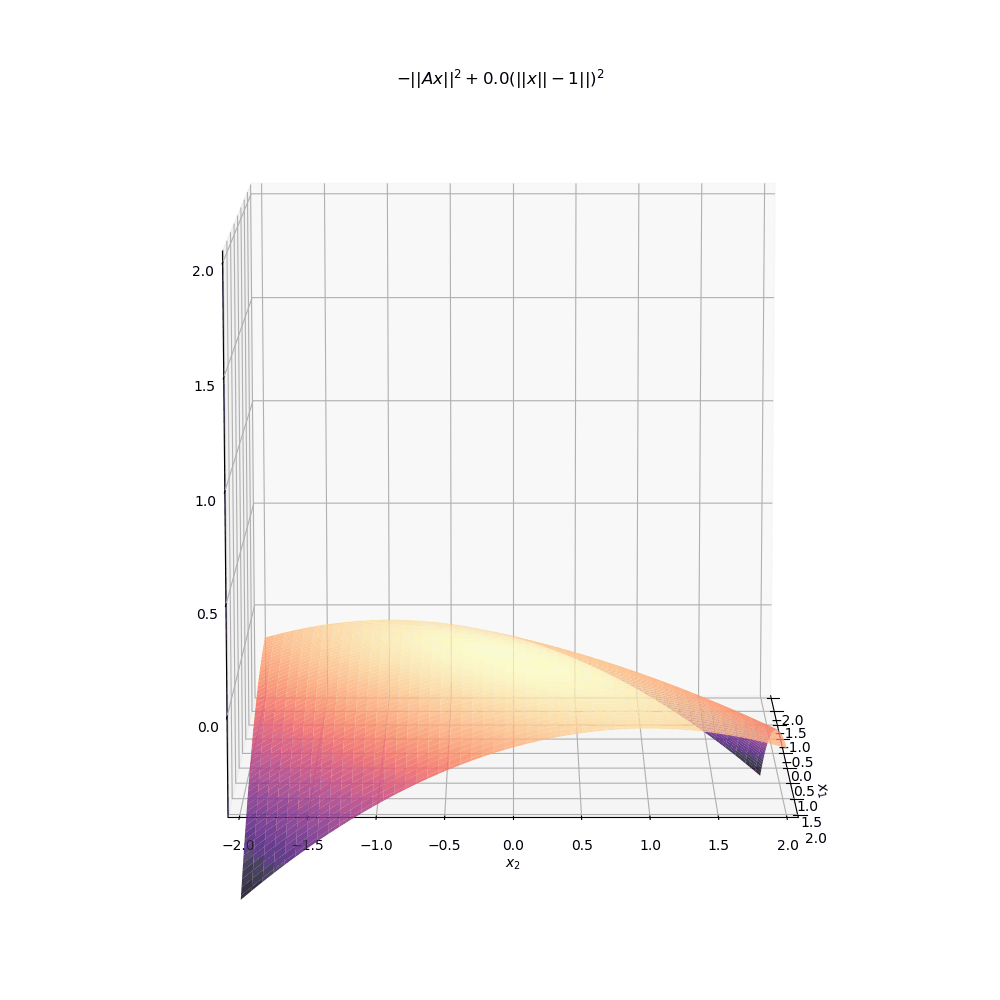 \[\begin{align*} \underset{x}{\text{minimize}}&\quad -||Ax||_2^2 + \mu \left(||x|| - 1\right)^2 \end{align*}\]The objective for the original constrained minimisation problem, \(-\left\| Ax \right\|^2\) is shown in the figure below
