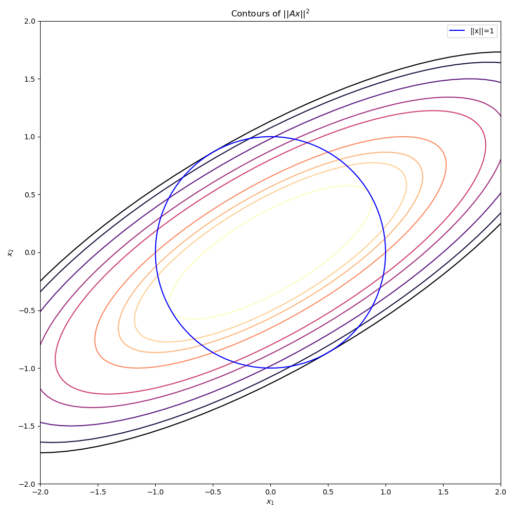 Another common constraint is ensuring a vector has unit length. The definition of the spectral norm of a matrix is defined by such an optimisation problem