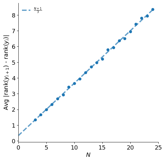 We can estimate this quantity by taking many uniformly shuffled \(y\)-values and measuring the average absolute rank difference. Repeating this experiment for various values of \(N\) gives us an idea of what the expected absolute rank difference is as a function of \(N\).