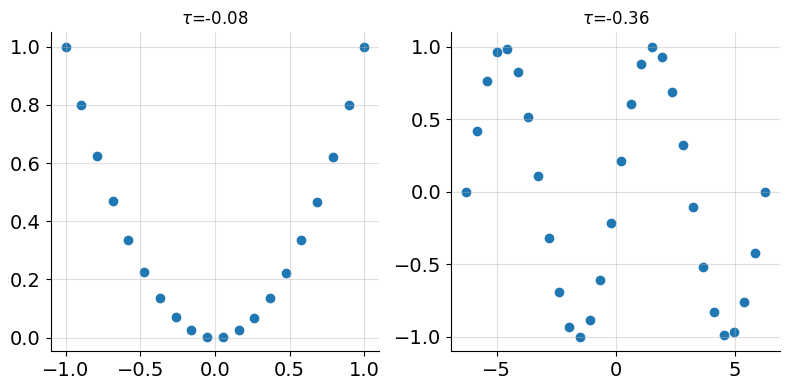 We’ll start by revisiting the non-linear data from figure 6. We saw that both Pearson’s and Spearman’s correlations failed to capture the clear functional relationships in the quadratic and sinusoidal datasets. Figure 8 shows the same data, this time including Chatterjee’s correlation.