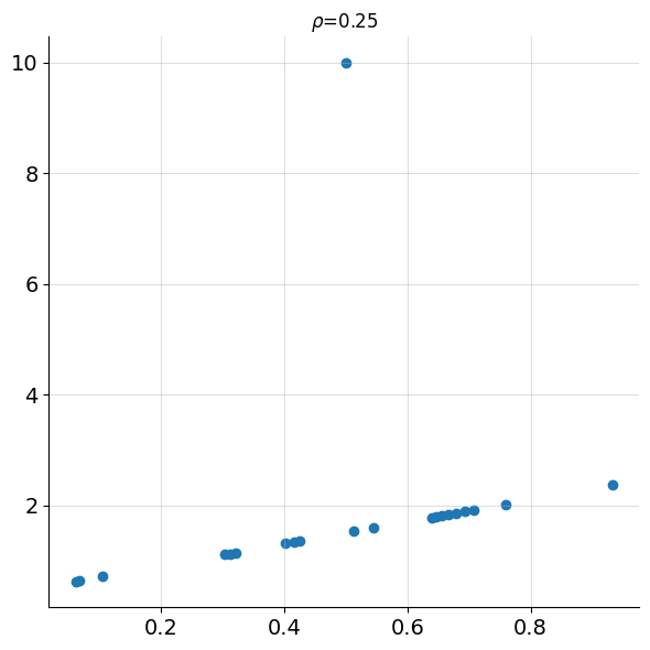 3: Since the normalisation is done against the expected value of a random permutation, rather than the worst case, it is possible for Chatterjee’s coefficient to be negative. Consider the \(y\)-ranks being \([1,3,2]\) after being ordered by \(x\). This would yield \(d = 9/8\) leading to \(\xi(x,y) = -1/8\).